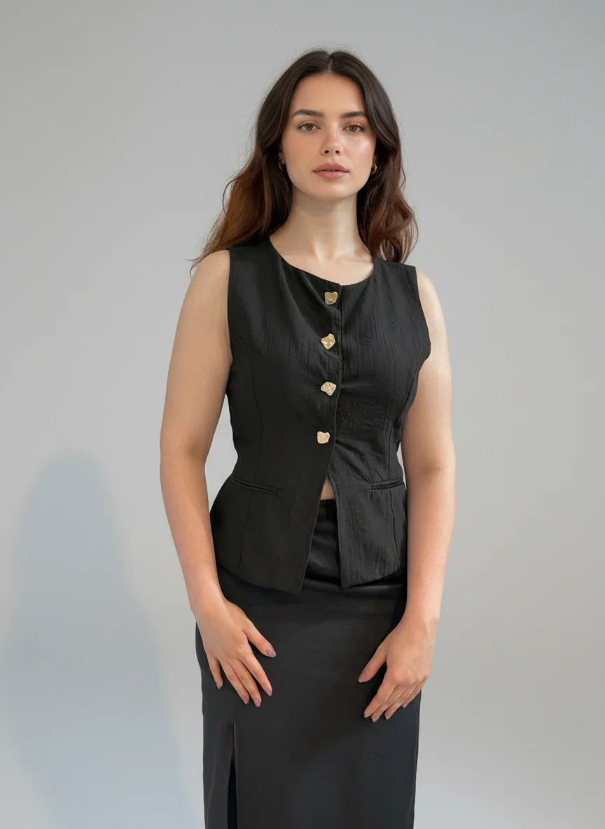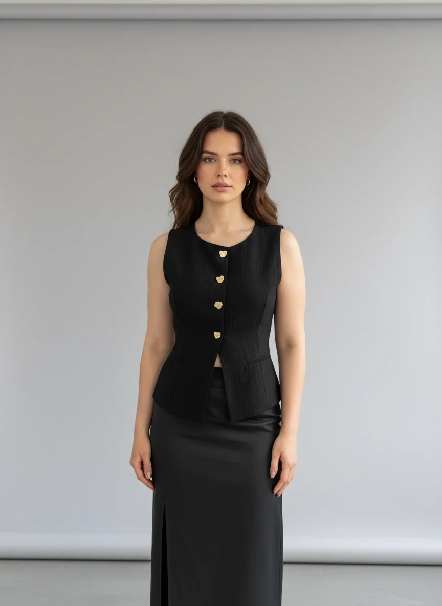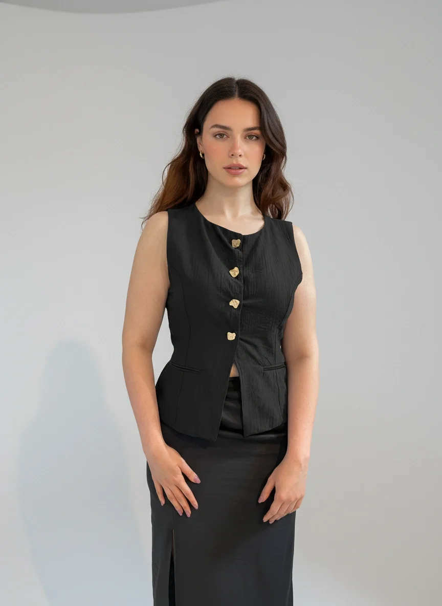 Siyah Düğme Detaylı Yelek